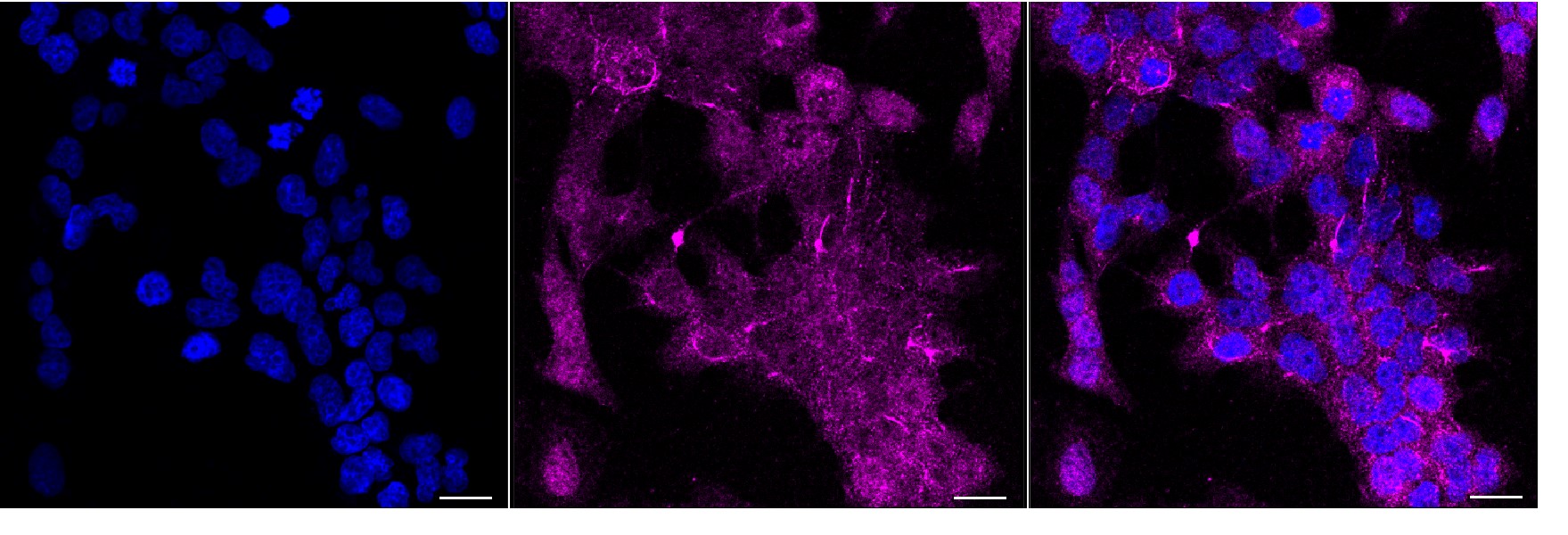 • Immunocytochemical staining of HeLa cells with phospho-RSK1(S380) antibody. Nuclei were stained blue with DAPI; Phospho-RSK1(S380) was stained magenta with Alexa Fluor® 647. Images were taken using Leica stellaris 5. Protein abundance based on laser Intensity and smart gain: Medium. Scale bar, 20 μm.