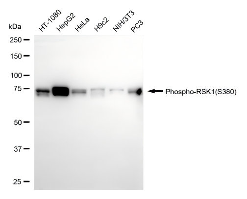 • Western blotting analysis using phospho-RSK1 (S380) antibody. Total cell lysates (30 μg) from various cell lines were loaded and separated by SDS-PAGE. The blot was incubated with phospho-RSK1 (S380) antibody and HRP-conjugated goat anti-rabbit secondary antibody respectively.