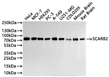 85 kDa lysosomal membrane sialoglycoprotein antibody; 85 kDa lysosomal sialoglycoprotein scavenger receptor class B member 2 antibody; AMRF antibody; CD36 antibody; CD36 antigen (collagen type I receptor; thrombospondin receptor)-like 2 (lysosomal integral membrane protein II) antibody; CD36 antigen antibody; CD36 antigen-like 2 antibody; CD36L2 antibody; EPM4 antibody; HLGP85 antibody; LGP85 antibody; LIMP 2 antibody; LIMP II antibody; LIMP2 antibody; LIMPII antibody; Lysosomal integral membrane protein II antibody; Lysosome membrane protein 2 antibody; Lysosome membrane protein II antibody; OTTHUMP00000160590 antibody; OTTHUMP00000219176 antibody; Scarb2 antibody; Scavenger receptor class B member 2 antibody; Scavenger receptor class B; member 2 antibody; SCRB2_HUMAN antibody; SR BII antibody; SRBII antibody