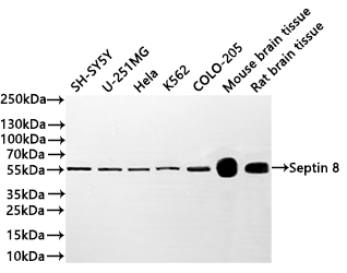 - Cloning, overexpression, purification and preliminary characterization of human septin 8. Fluorescence emission spectra, analytic gel filtration and DLS reflect the sample oligomeric heterogeneity with the predominance of dimers in solution. PMID: 20544379