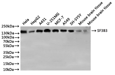 Western BlotPositive WB detected in: Hela whole cell lysate(30µg), HepG2 whole cell lysate(30µg), A431 whole cell lysate(30µg), U-251MG whole cell lysate(30µg), MCF-7 whole cell lysate(30µg), A549 whole cell lysate(30µg), SH-SY5Y whole cell lysate(30µg), Mouse brain tissue lysate(30µg), Rat brain tissue lysate(30µg)