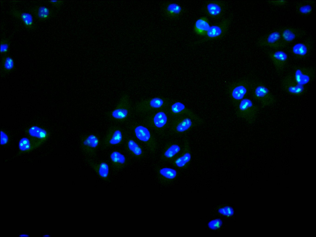 • Immunofluorescence staining of Hela cell with CSB-RA030568A0HU at 1:50 , counter-stained with DAPI. The cells were fixed in 4% formaldehyde, permeabilized using 0.2% Triton X-100 and blocked in 10% normal Goat Serum. The cells were then incubated with the antibody overnight at 4°C. The secondary antibody was Alexa Fluor 488-congugated AffiniPure Goat Anti-Rabbit IgG(H+L).