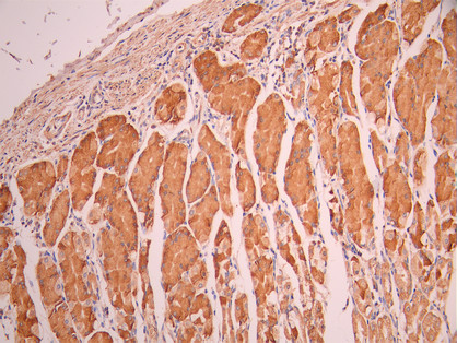 • IHC image of CSB-RA030568A0HU diluted at 1:100 and staining in paraffin-embedded human stomach tissue performed on a Leica BondTM system. After dewaxing and hydration, antigen retrieval was mediated by high pressure in a citrate buffer (pH 6.0). Section was blocked with 10% normal goat serum 30min at RT. Then primary antibody (1% BSA) was incubated at 4°C overnight. The primary is detected by a Goat anti-rabbit polymer IgG labeled by HRP and visualized using 0.05% DAB.