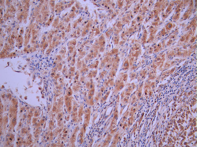 • IHC image of CSB-RA030568A0HU diluted at 1:100 and staining in paraffin-embedded human liver cancer performed on a Leica BondTM system. After dewaxing and hydration, antigen retrieval was mediated by high pressure in a citrate buffer (pH 6.0). Section was blocked with 10% normal goat serum 30min at RT. Then primary antibody (1% BSA) was incubated at 4°C overnight. The primary is detected by a Goat anti-rabbit polymer IgG labeled by HRP and visualized using 0.05% DAB.