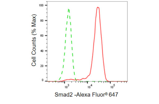 • Flow cytometric analysis of Smad2 expression in HepG2 cells using Smad2 antibody. Green, isotype control; red, Smad2.