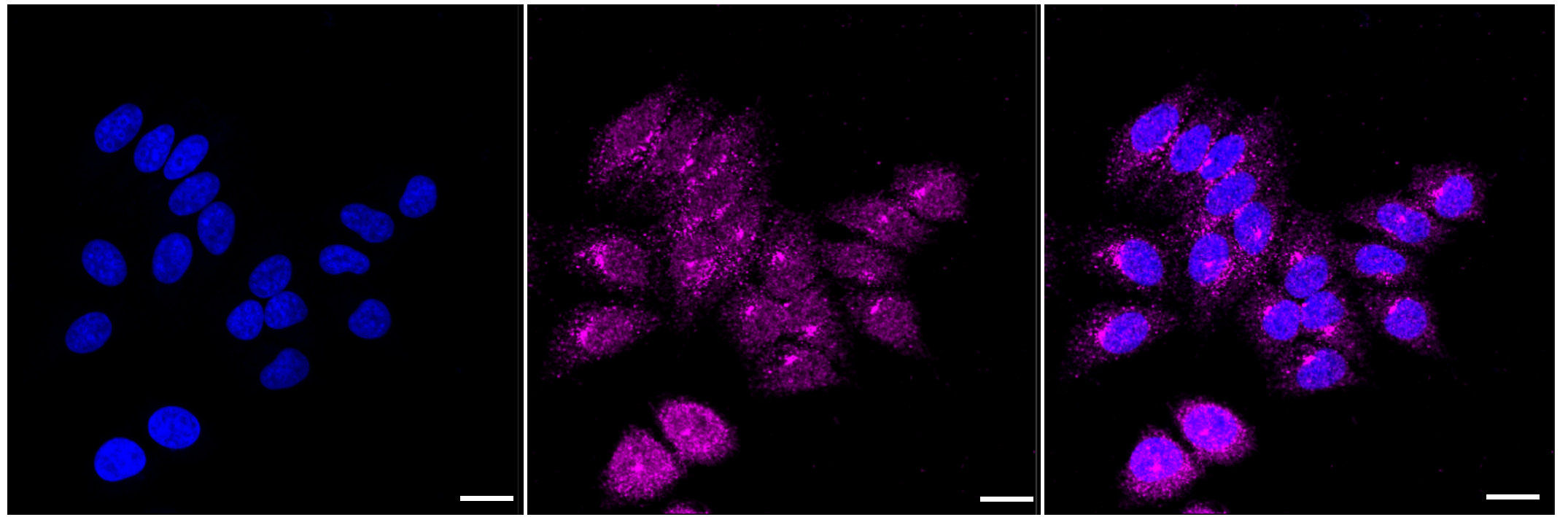 • Immunocytochemical staining of HepG2 cells with Smad2 antibody. Nuclei were stained blue with DAPI; Smad2 as stained magenta with Alexa Fluor® 647. Images were taken using Leica stellaris 5. Protein abundance based on laser Intensity and smart gain: Medium. Scale bar: 20 μm.