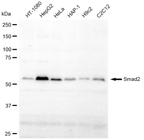 • Western blotting analysis using Smad2 antibody. Total cell lysates (30 μg) from various cell lines were loaded and separated by SDS-PAGE. The blot was incubated with Smad2 antibody and HRP-conjugated goat anti-rabbit secondary antibody respectively.