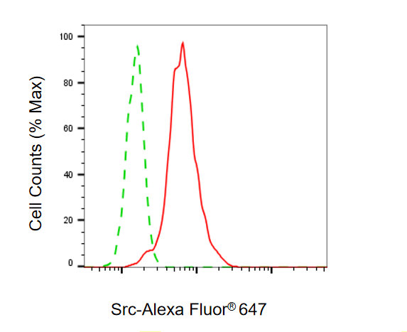 • Flow cytometric analysis of Src expression in HeLa cells using Src antibody. Green, isotype control; red, Src.