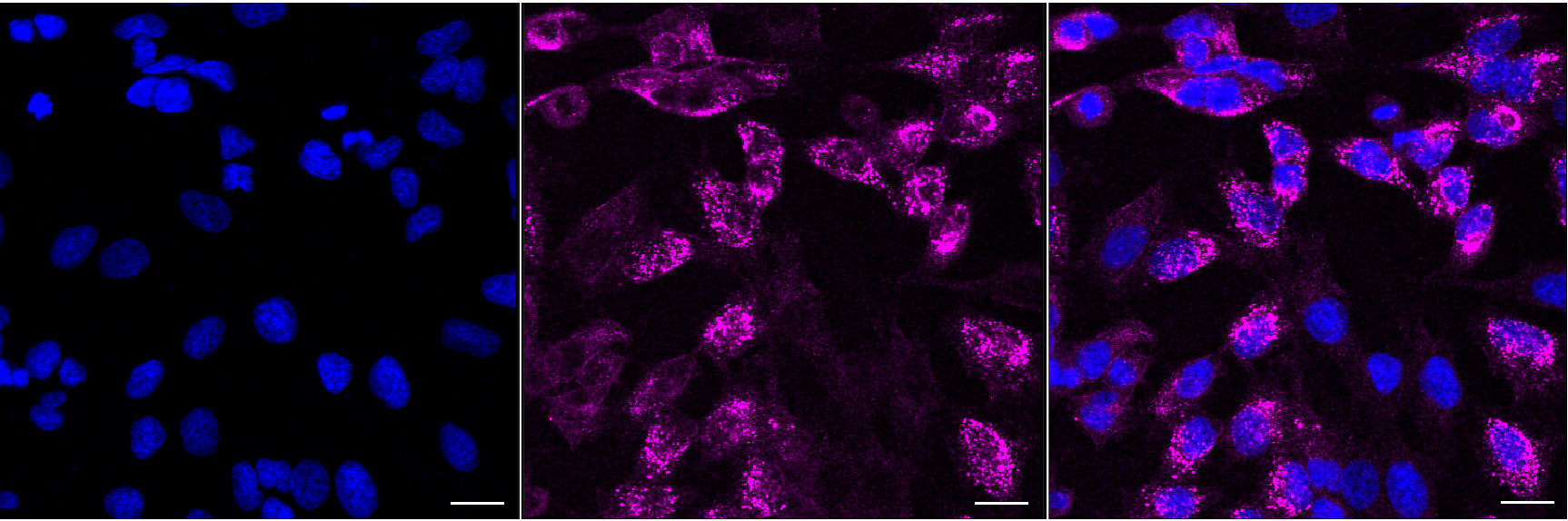 • Immunocytochemical staining of HeLa cells with SRC antibody. Nuclei were stained blue with DAPI; SRC was stained magenta with Alexa Fluor® 647. Images were taken using Leica stellaris 5. Protein abundance based on laser Intensity and smart gain: Medium. Scale bar, 20 μm.
