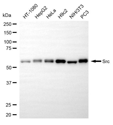 • Western blotting analysis using src antibody. Total cell lysates (30 μg) from various cell lines were loaded and separated by SDS-PAGE. The blot was incubated with src antibody and HRP-conjugated goat anti-rabbit secondary antibody respectively.