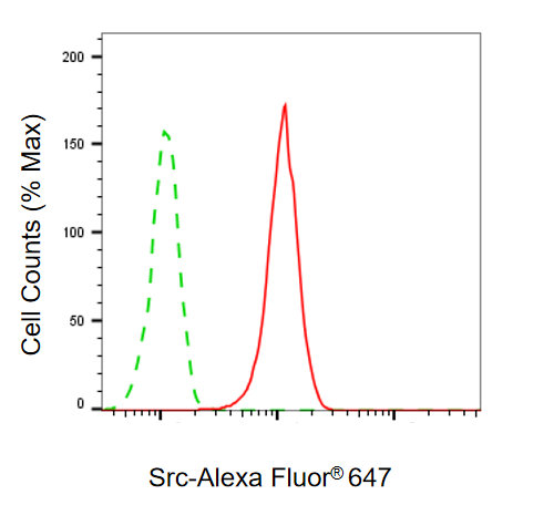 • Flow cytometric analysis of Src expression in HAP-1 cells using Src antibody. Green, isotype control; red, Src.