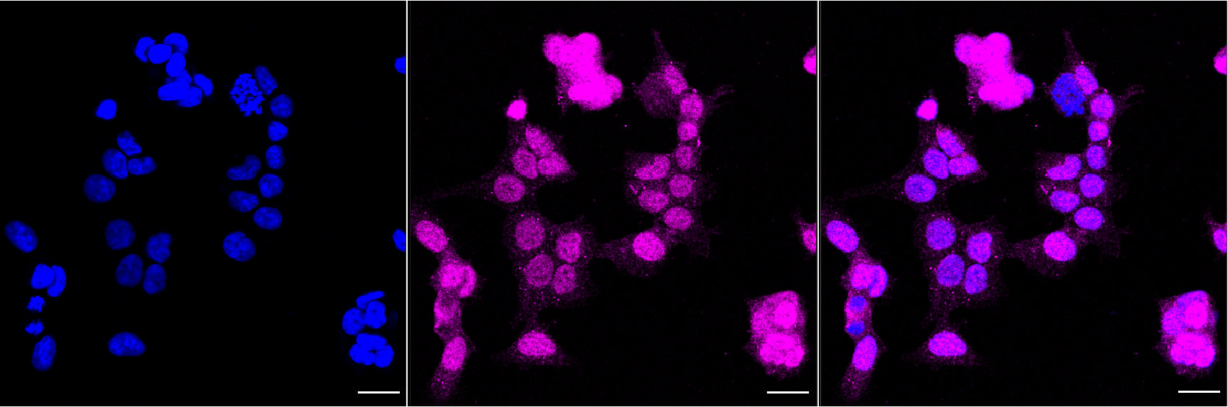 • Immunocytochemical staining of HAP-1 cells with Src antibody. Nuclei were stained blue with DAPI; Src was stained magenta with Alexa Fluor® 647. Images were taken using Leica stellaris 5. Protein abundance based on laser Intensity and smart gain: Medium. Scale bar, 20 μm.