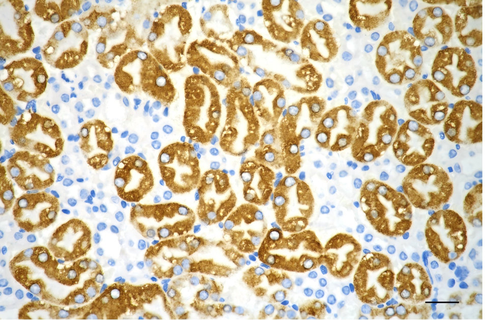 • Immunohistochemistry was performed on paraffin-embedded mouse kidney using SRC antibody. Antigen retrieval was done in sodium citrate buffer (pH 6.0). DAB was used for detection, with hematoxylin counterstaining. Images were acquired using a Nikon Ci-L Plus microscope (40× objective). Scale bar: 25 μm.