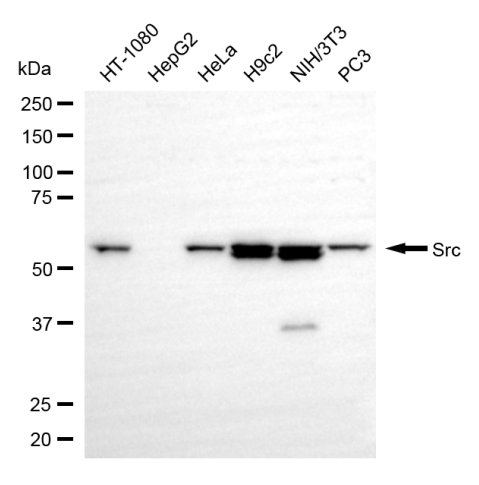 • Western blotting analysis using src antibody. Total cell lysates (30 μg) from various cell lines were loaded and separated by SDS-PAGE. The blot was incubated with src antibody and HRP-conjugated goat anti-rabbit secondary antibody respectively.