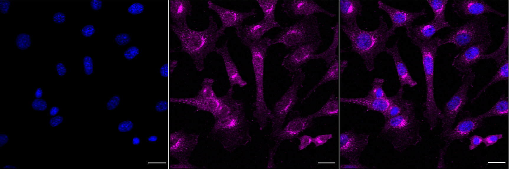 • Immunocytochemical staining of HeLa cells with Src antibody. Nuclei were stained blue with DAPI; Src was stained magenta with Alexa Fluor® 647. Images were taken using Leica stellaris 5. Protein abundance based on laser Intensity and smart gain: Medium. Scale bar, 20 μm.