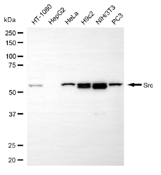 • Western blotting analysis using src antibody. Total cell lysates (30 μg) from various cell lines were loaded and separated by SDS-PAGE. The blot was incubated with src antibody and HRP-conjugated goat anti-rabbit secondary antibody respectively.