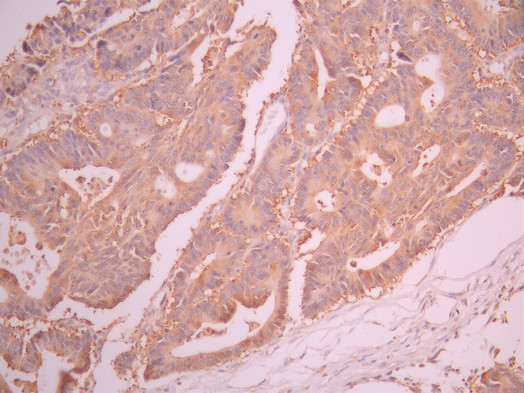 IHC image of CSB-RA921465A0HU diluted at 1:100 and staining in paraffin-embedded human colorectal cancer performed on a Leica BondTM system. After dewaxing and hydration, antigen retrieval was mediated by high pressure in a citrate buffer (pH 6.0). Section was blocked with 10% normal goat serum 30min at RT. Then primary antibody (1% BSA) was incubated at 4°C overnight. The primary is detected by a Goat anti-rabbit polymer IgG labeled by HRP and visualized using 0.05% DAB.