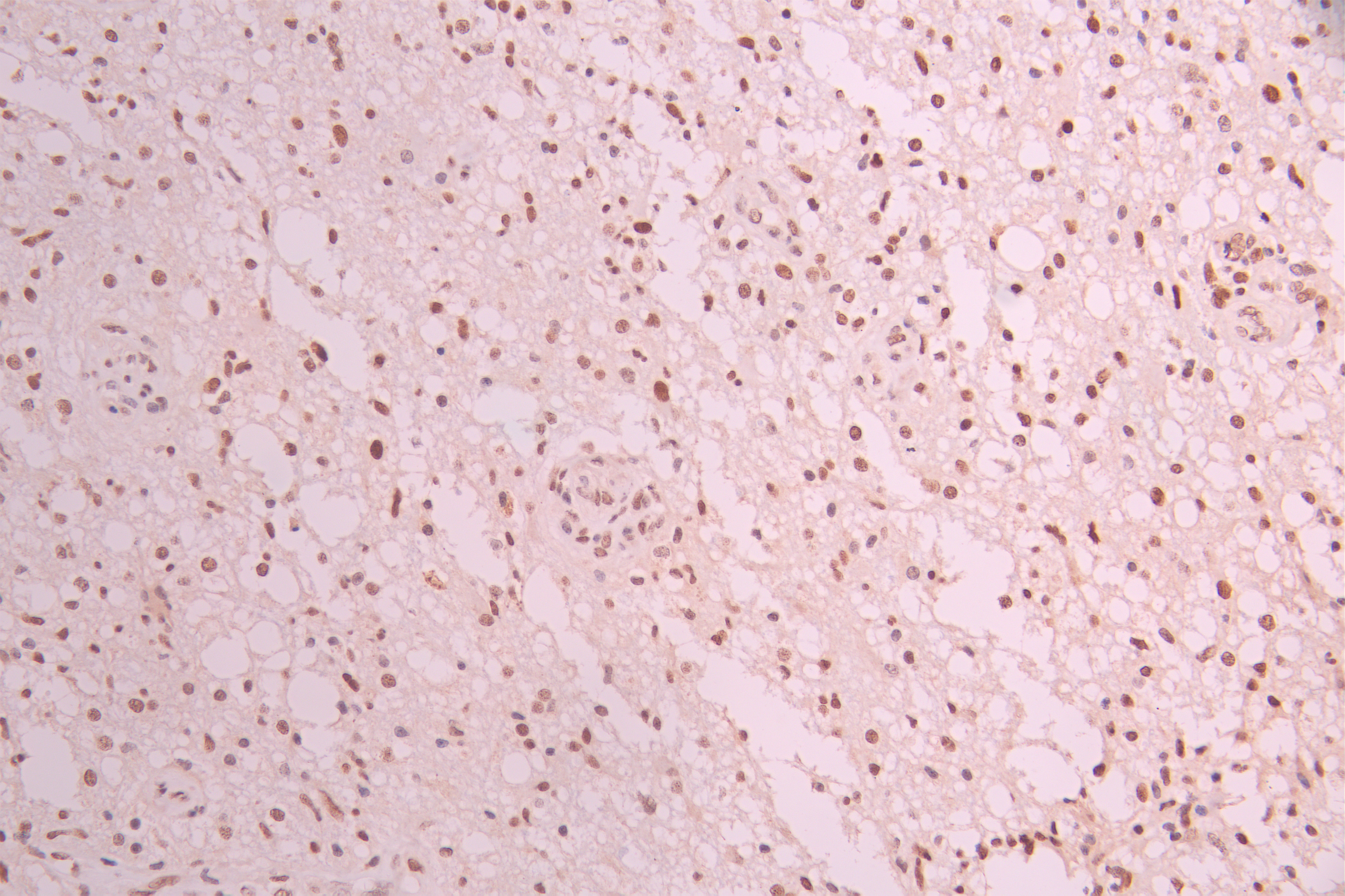 • IHC image of CSB-RA778009A0HU diluted at 1:100 and staining in paraffin-embedded human glioma cancer performed on a Leica BondTM system. After dewaxing and hydration, antigen retrieval was mediated by high pressure in a citrate buffer (pH 6.0). Section was blocked with 10% normal goat serum 30min at RT. Then primary antibody (1% BSA) was incubated at 4°C overnight. The primary is detected by a Goat anti-rabbit polymer IgG labeled by HRP and visualized using 0.05% DAB.