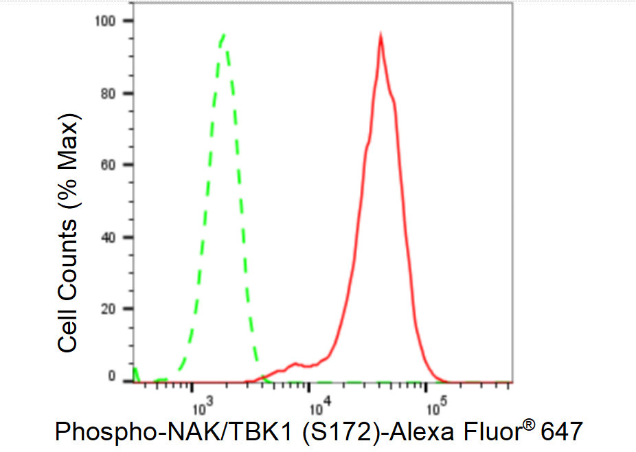 • Flow cytometric analysis of Phospho-NAK/TBK1 (S172) expression in HepG2 cells using Phospho-NAK/TBK1 (S172) antibody. Green, isotype control; red, Phospho-NAK/TBK1 (S172).