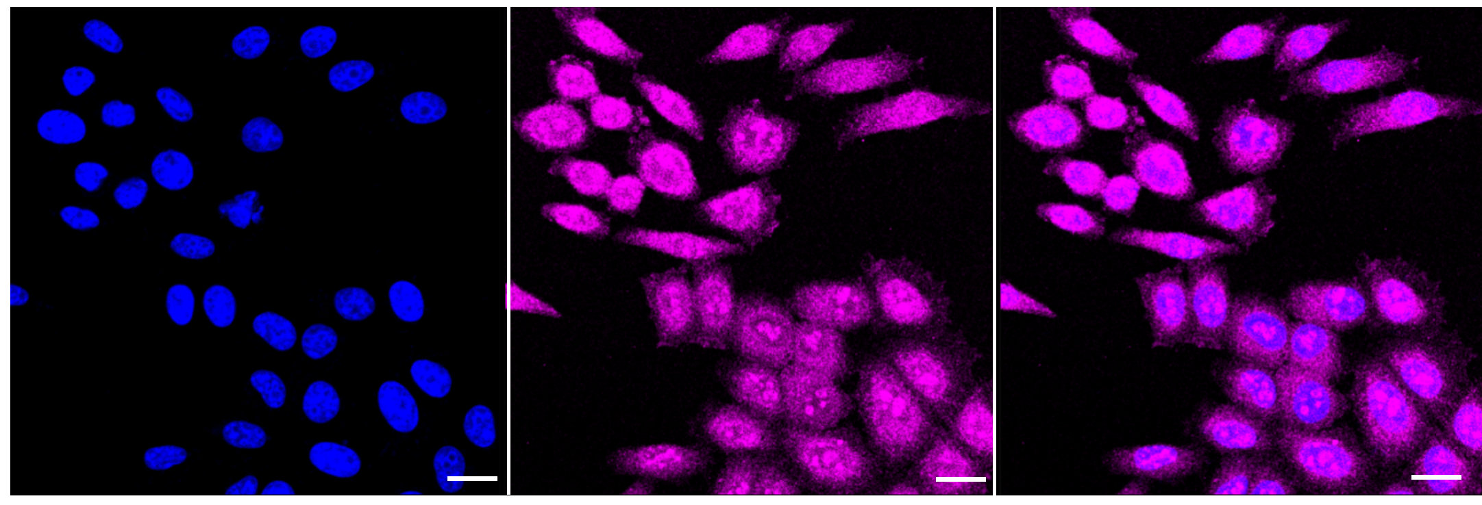 • Immunocytochemical staining of HepG2 cells with Phospho-NAK/TBK1 (S172) antibody. Nuclei were stained blue with DAPI; Phospho-NAK/TBK1 (S172) was stained magenta with Alexa Fluor® 647. Images were taken using Leica stellaris 5. Protein abundance based on laser Intensity and smart gain: Medium. Scale bar: 20 μm.