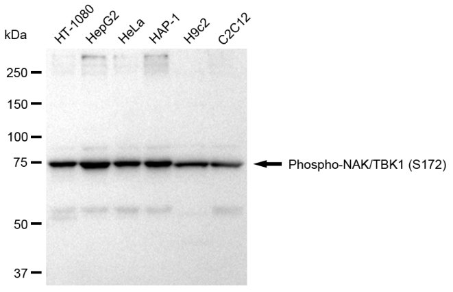 • Western blotting analysis using Phospho-NAK/TBK1 (S172) antibody. Total cell lysates (30 μg) from various cell lines were loaded and separated by SDS-PAGE. The blot was incubated with Phospho-NAK/TBK1 (S172) antibody and HRP-conjugated goat anti-rabbit secondary antibody respectively.