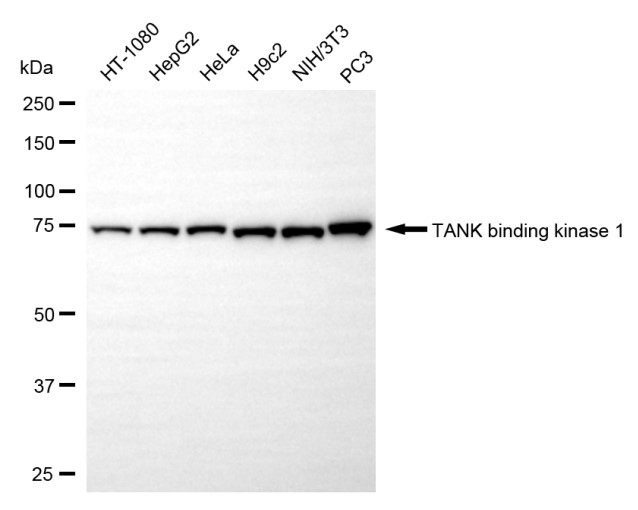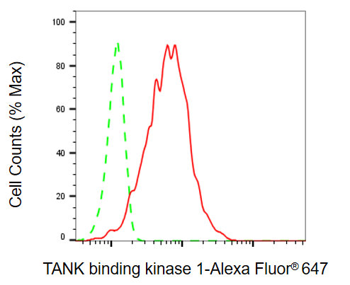 Serine/threonine kinase that plays an essential role in regulating inflammatory responses to foreign agents. Following activation of toll-like receptors by viral or bacterial components, associates with TRAF3 and TANK and phosphorylates interferon regulatory factors (IRFs) IRF3 and IRF7 as well as DDX3X. This activity allows subsequent homodimerization and nuclear translocation of the IRFs leading to transcriptional activation of pro-inflammatory and antiviral genes including IFNA and IFNB. In order to establish such an antiviral state, TBK1 form several different complexes whose composition depends on the type of cell and cellular stimuli. Plays a key role in IRF3 activation: acts by first phosphorylating innate adapter proteins MAVS, STING1 and TICAM1 on their pLxIS motif, leading to recruitment of IRF3, thereby licensing IRF3 for phosphorylation by TBK1. Phosphorylated IRF3 dissociates from the adapter proteins, dimerizes, and then enters the nucleus to induce expression of interferons. Thus, several scaffolding molecules including FADD, TRADD, MAVS, AZI2, TANK or TBKBP1/SINTBAD can be recruited to the TBK1-containing-complexes. Under particular conditions, functions as a NF-kappa-B effector by phosphorylating NF-kappa-B inhibitor alpha/NFKBIA, IKBKB or RELA to translocate NF-Kappa-B to the nucleus. Restricts bacterial proliferation by phosphorylating the autophagy receptor OPTN/Optineurin on 'Ser-177', thus enhancing LC3 binding affinity and antibacterial autophagy. Phosphorylates SMCR8 component of the C9orf72-SMCR8 complex, promoting autophagosome maturation. Phosphorylates and activates AKT1. Seems to play a role in energy balance regulation by sustaining a state of chronic, low-grade inflammation in obesity, wich leads to a negative impact on insulin sensitivity. Attenuates retroviral budding by phosphorylating the endosomal sorting complex required for transport-I (ESCRT-I) subunit VPS37C. Phosphorylates Borna disease virus (BDV) P protein. Plays an essential role in the TLR3- and IFN-dependent control of herpes virus HSV-1 and HSV-2 infections in the central nervous system.