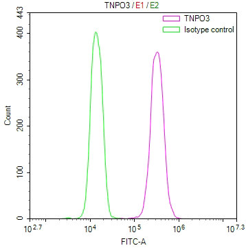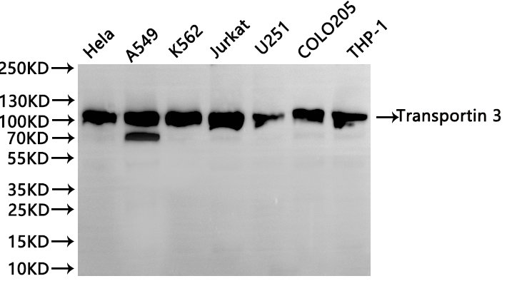 Importin, which transports target proteins into the nucleus. Specifically mediates the nuclear import of splicing factor serine/arginine (SR) proteins, such as RBM4, SFRS1 and SFRS2, by recognizing phosphorylated SR domains. Also mediates the nuclear import of serine/arginine (SR) protein CPSF6, independently of CPSF6 phosphorylation. The nuclear import process is regulated by the small GTPase Ran that partitions between cytoplasm and nucleus in the predominantly GDP- and GTP-bound form, respectively. Importin associates with target cargo proteins in the cytoplasm, and the competitive binding of GTP-bound Ran induces the release of cargos in the nucleus.; (Microbial infection) Involved in immunodeficiency virus (HIV-1) infection by importing the pre-integration complex (PIC) into the nucleus. Required for a nuclear maturation step of HIV-1 prior to integration.