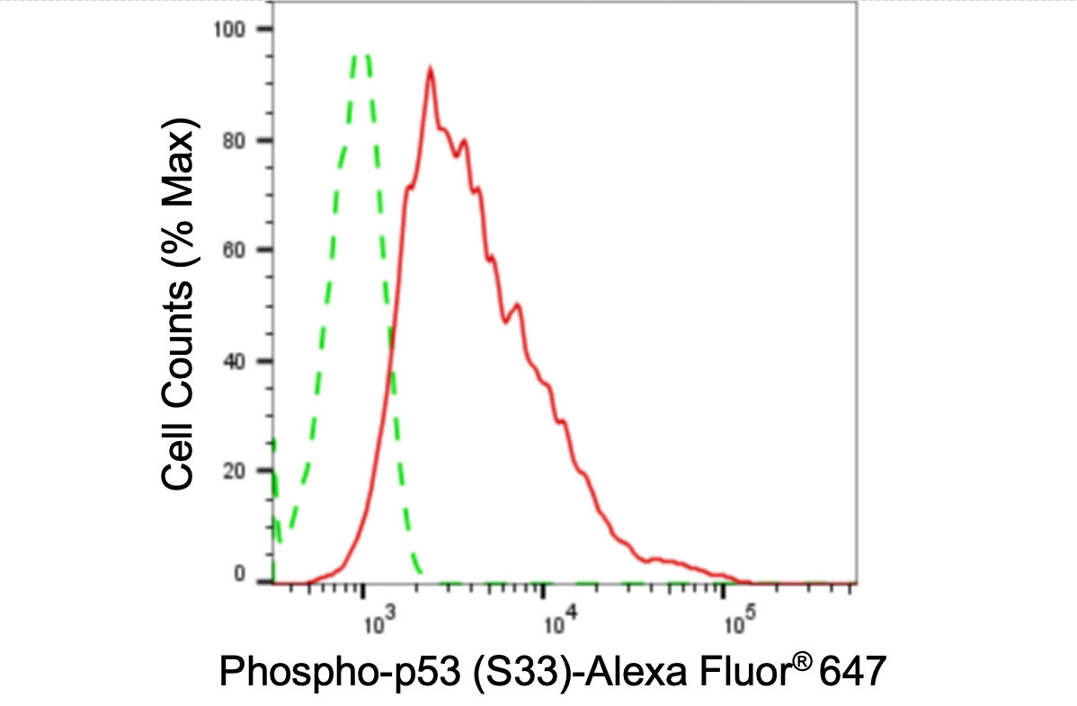 • Flow cytometric analysis of phospho-p53 (S33) expression in HeLa cells using phospho-p53 (S33) antibody. Green, isotype control; red, phospho-p53 (S33).