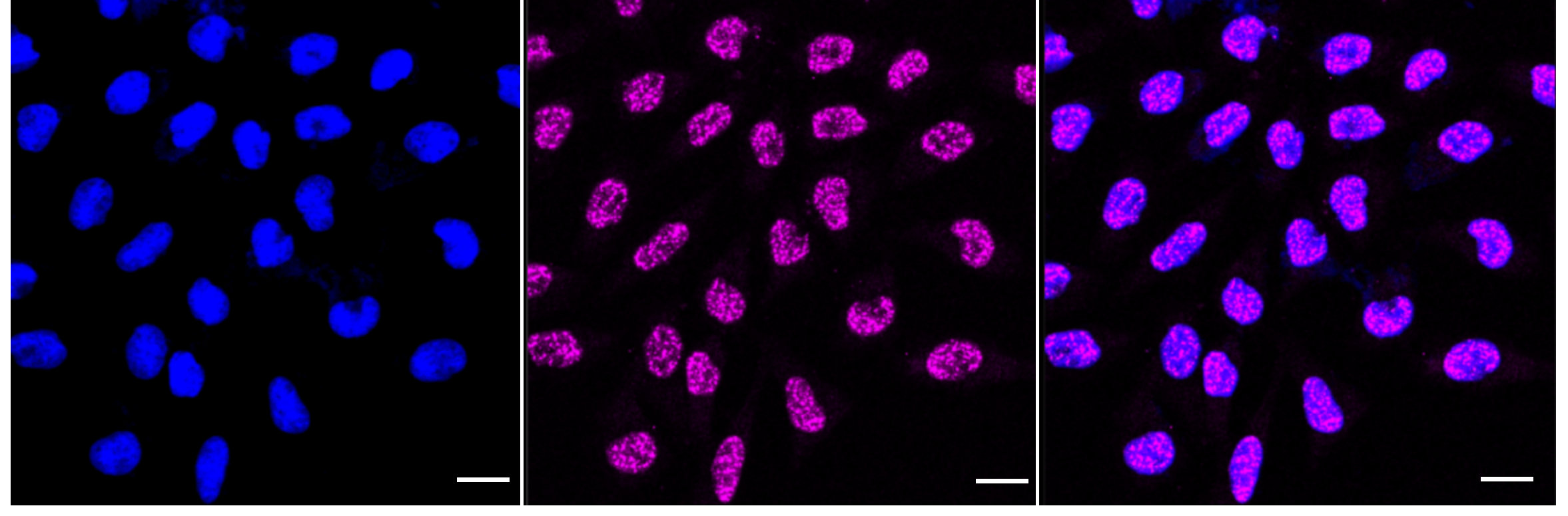 • Immunocytochemical staining of Hela cells with phospho-p53 (S33) antibody. Nuclei were stained blue with DAPI; Phospho-p53 (S33) was stained magenta with Alexa Fluor® 647. Images were taken using Leica stellaris 5. Protein abundance based on laser Intensity and smart gain: High. Scale bar: 20 μm.