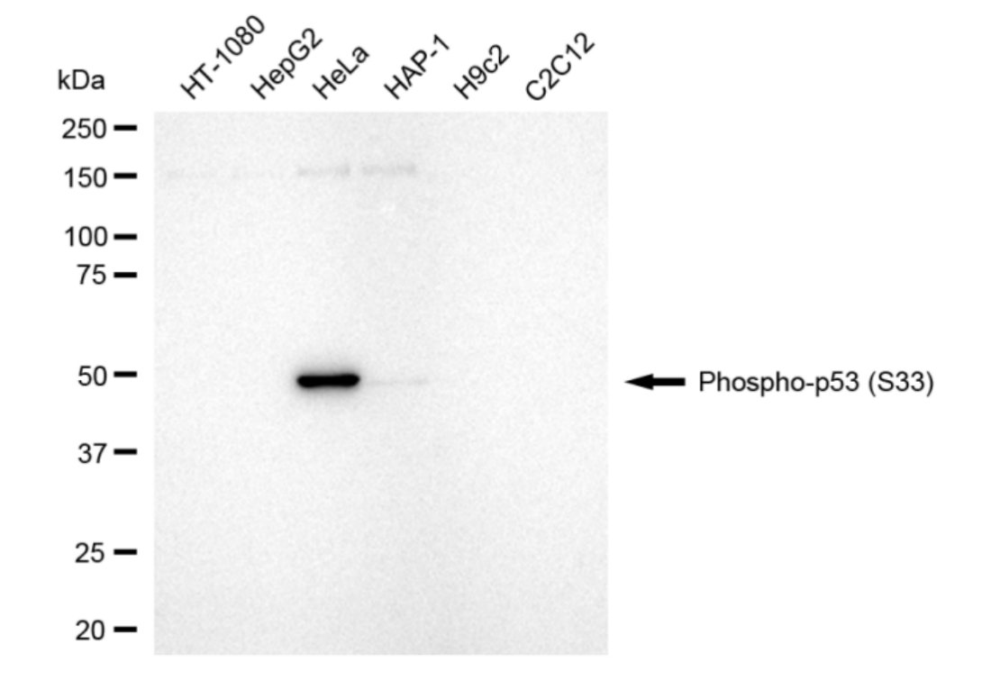 • Western blotting analysis using phospho-p53 (S33) antibody. Total cell lysates (30 μg) from various cell lines were loaded and separated by SDS-PAGE. The blot was incubated with phospho-p53 (S33) antibody and HRP-conjugated goat anti-rabbit secondary antibody respectively.