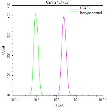 Overlay Peak curve showing Hela cells stained with CSB-RA043670A0HU (red line) at 1:100. The cells were fixed in 4% formaldehyde and permeated by 0.2% TritonX-100 for 10min. Then 10% normal goat serum to block non-specific protein-protein interactions followed by the antibody (1ug/1*106cells) for 45min at 4℃. The secondary antibody used was FITC-conjugated goat anti-rabbit IgG (H+L) at 1/200 dilution for 35min at 4℃.Control antibody (green line) was Rabbit IgG (1ug/1*106cells) used under the same conditions. Acquisition of >10, 000 events was performed.