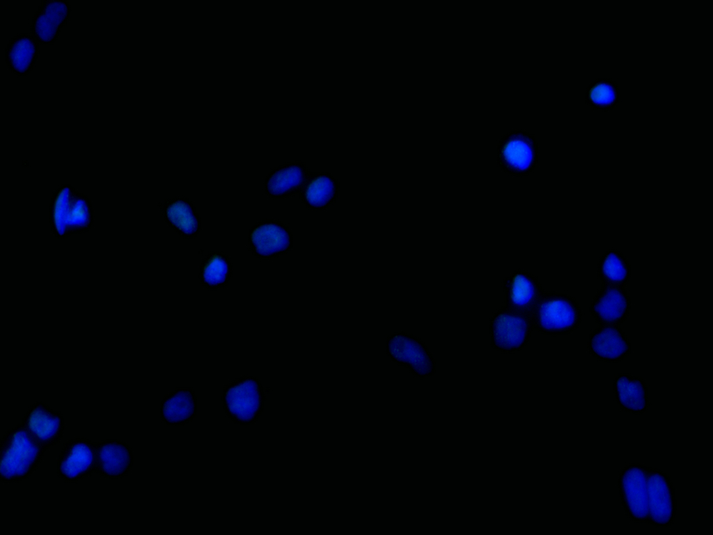 Immunofluorescence staining of A-431 cell with CSB-RA043670A0HU at 1:50 , counter-stained with DAPI. The cells were fixed in 4% formaldehyde, permeabilized using 0.2% Triton X-100 and blocked in 10% normal Goat Serum. The cells were then incubated with the antibody overnight at 4°C. The secondary antibody was Alexa Fluor 488-congugated AffiniPure Goat Anti-Rabbit IgG(H+L).