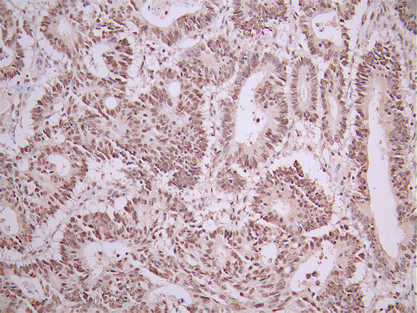IHC image of CSB-RA043670A0HU diluted at 1:100 and staining in paraffin-embedded human colorectal cancer performed on a Leica BondTM system. After dewaxing and hydration, antigen retrieval was mediated by high pressure in a citrate buffer (pH 6.0). Section was blocked with 10% normal goat serum 30min at RT. Then primary antibody (1% BSA) was incubated at 4°C overnight. The primary is detected by a Goat anti-rabbit polymer IgG labeled by HRP and visualized using 0.05% DAB.