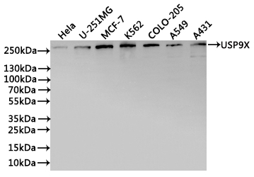 Positive WB detected in: Hela whole cell lysate(30µg), U-251MG whole cell lysate(30µg), MCF-7 whole cell lysate(30µg), K562 whole cell lysate(30µg), COLO-205 whole cell lysate(30µg), A549 whole cell lysate(30µg), A431 whole cell lysate(30µg)