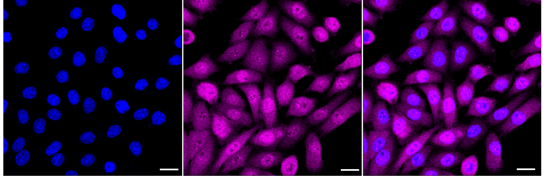 • Immunocytochemical staining of HepG2 cells with YAP1 antibody. Nuclei were stained blue with DAPI; YAP1 was stained magenta with Alexa Fluor® 647. Images were taken using Leica stellaris 5. Protein abundance based on laser Intensity and smart gain: High. Scale bar: 20 μm.