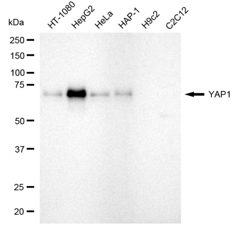 • Western blotting analysis using YAP1 antibody. Total cell lysates (30 μg) from various cell lines were loaded and separated by SDS-PAGE. The blot was incubated with YAP1 antibody and HRP-conjugated goat anti-rabbit secondary antibody respectively.