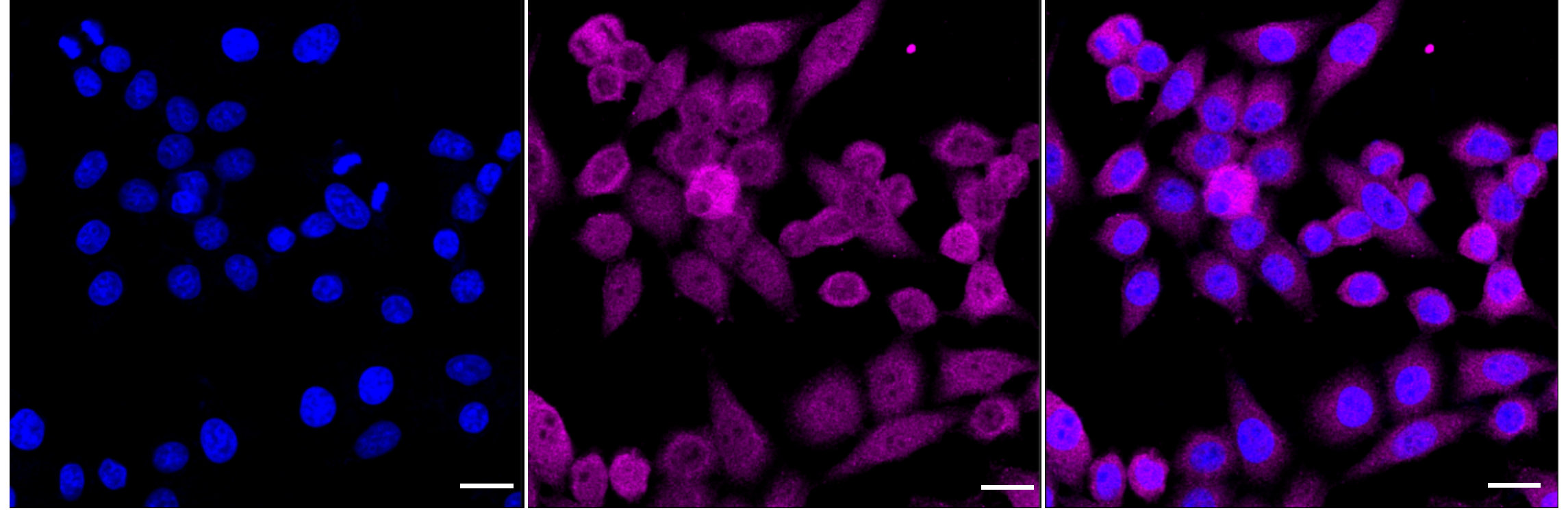 • Immunocytochemical staining of HepG2 cells with Phospho-YAP1 (S127) antibody. Nuclei were stained blue with DAPI; Phospho-YAP1 (S127) was stained magenta with Alexa Fluor® 647. Images were taken using Leica stellaris 5. Protein abundance based on laser Intensity and smart gain: High. Scale bar: 20 μm.