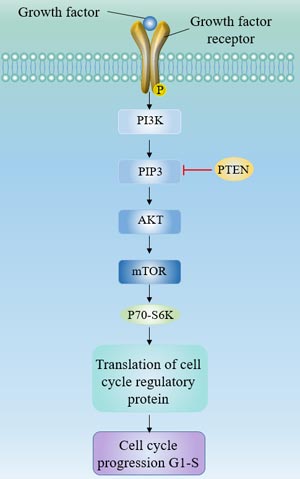 mTORC1 and mTORC2 are important components in this signaling pathway. mTORC1 is a downstream signal of AKT, which activates S6 kinase to regulate protein synthesis and induces cell cycle progression from G1 phase to S phase [9].